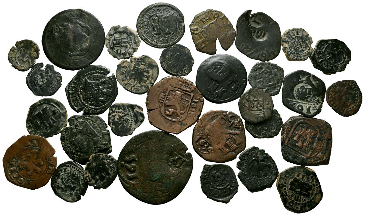 MONARQUÍA ESPAÑOLA. Interesante conjunto formado por decenas monedas de cobre y vellón acuñados durante los reinados de Felipe II y Felipe III. Diferentes módulos y variedad de cecas de acuñación. El conjunto incluye un buen número de piezas reselladas. Diferentes estados de conservación. A EXAMINAR.