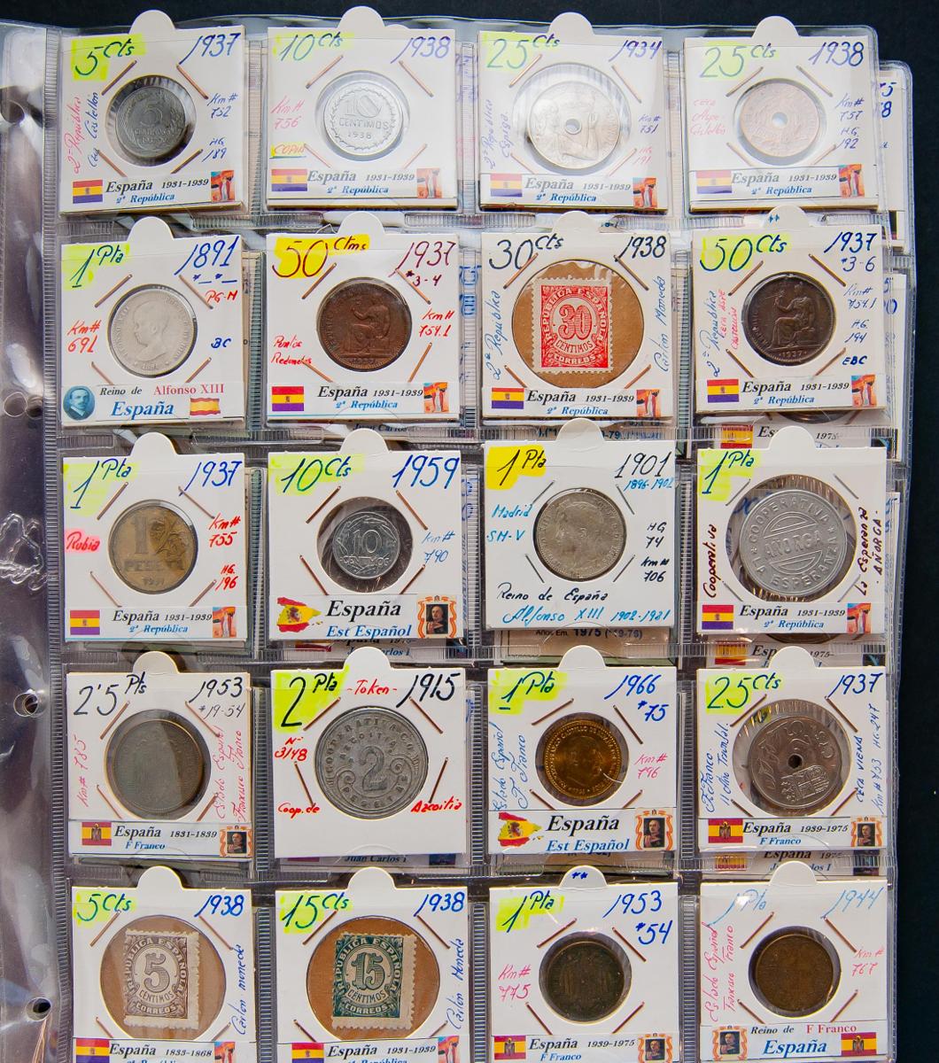 ESPAÑA. Bonitas colección compuesta por más de 150 monedas en su mayoría acuñadas bajo el reinado de Juan Carlos I aunque también se incluyes piezas desde el Centenario de la Peseta, II República y Estado Español. En el conjunto se incluye un cartucho de 1 Peseta de la emisión de 1975 *80, sellos monedas, algunos tokens y la serie completa de los Euros de Churriana. La colección tiene, en general, un buen o muy buen estado de conservación. A EXAMINAR.