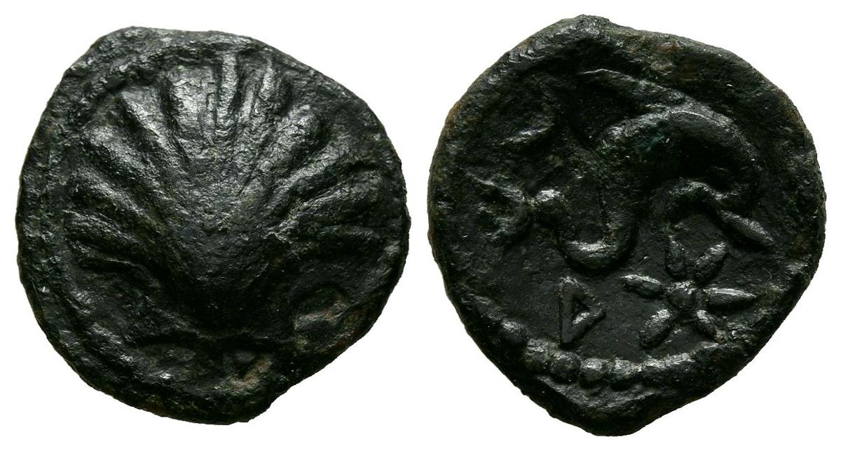 ARSE-SAGUNTO (Sagunto, Valencia). Sextante. (Ae. 1,16g/13mm). 170-20 a.C. (FAB-2064). Anv: Concha. Rev: Delfín a derecha, encima creciente, debajo letra ibérica A y estrella. MBC+. Pátina oscura.