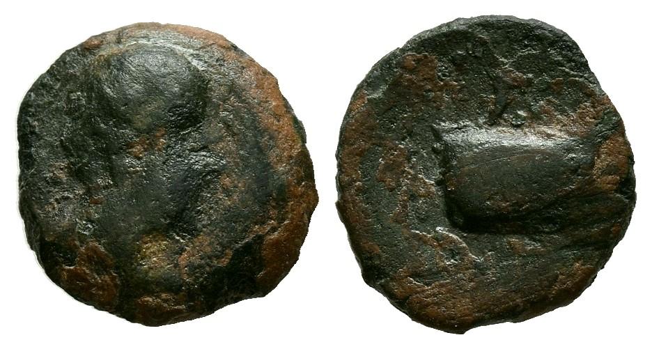 ARSE-SAGUNTO (Sagunto, Valencia). Cuadrante. (Ae. 0,74g/10mm). 150-100 a.C. (FAB-2074A). Anv: Cabeza masculina a derecha. Rev: Proa a derecha. MBC-. Raro ejemplar.