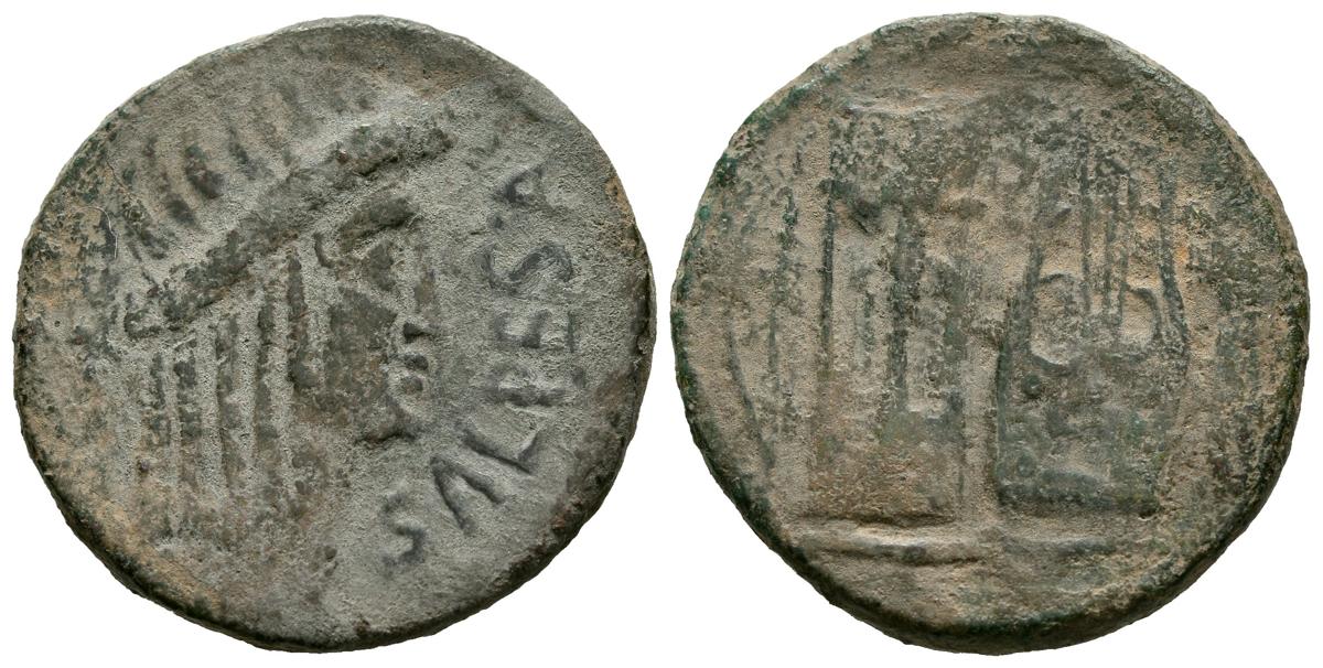 SALPESA (cerca de Utrera, Sevilla). As. (Ae. 7,65g/25mm). 50 a.C. (FAB-2109). Anv: Cabeza didemada de Apolo a derecha, delante leyenda: SALPESA. Rev: Trípode y lira entre arco y aljaba. MBC. Escaso ejemplar.