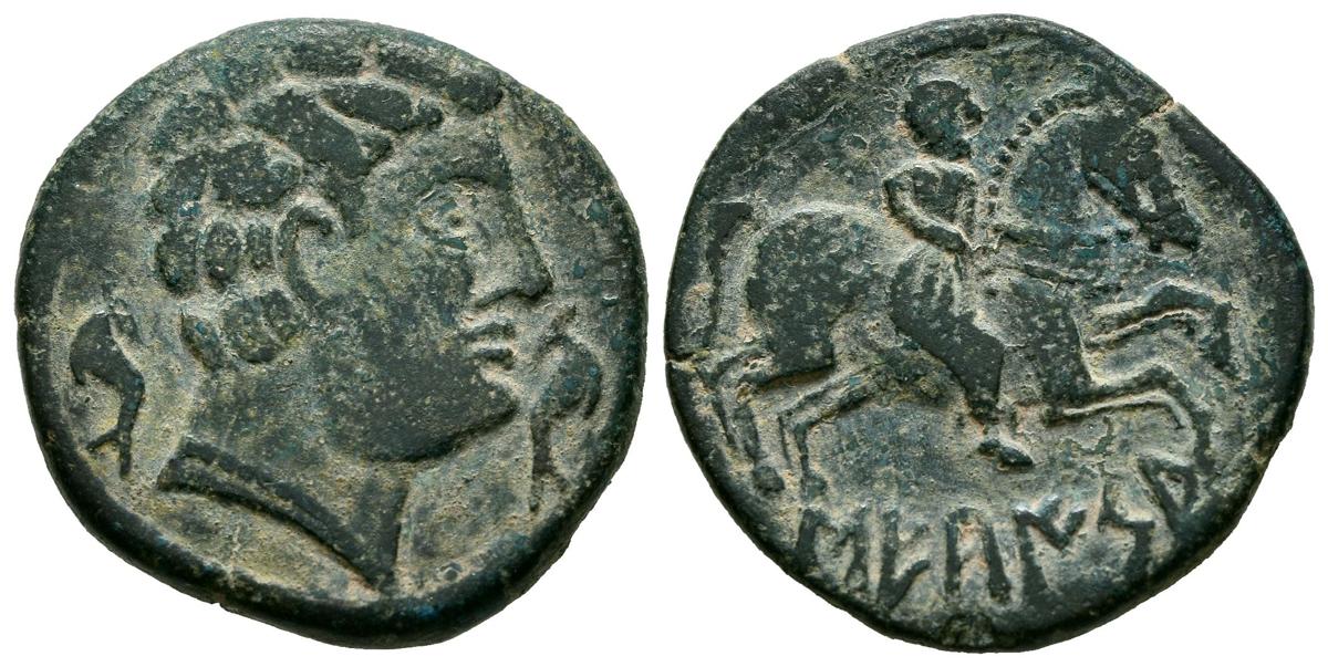 SECAISA (Belmonte, Zaragoza). As. (Ae. 7,63g/22mm). 120-20 a.C. (FAB-2131; ACIP 1559). Anv: Cabeza masculina a derecha, entre dos delfines. Rev: Jinete con las dos manos en las riendas a derecha, debajo leyenda ibérica curva: SECaISA. MBC. Pátina verde. Escaso.