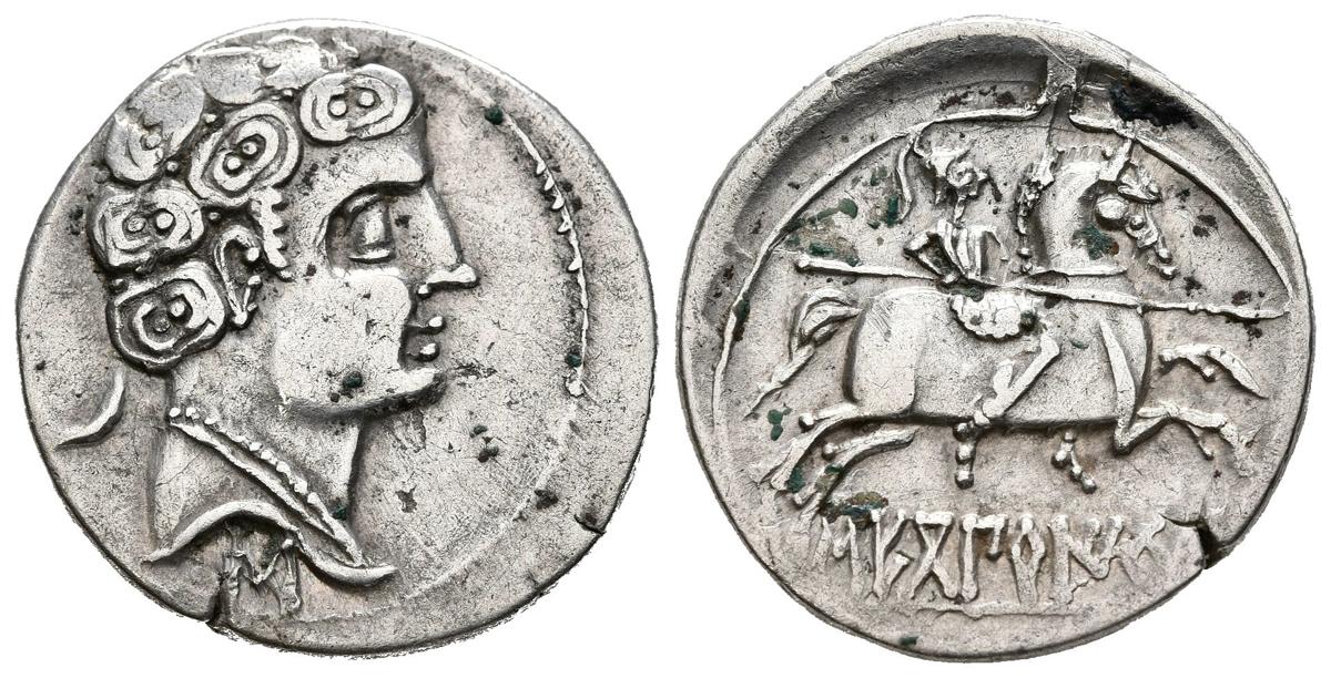 SECOBIRICES (Saelices, Cuenca). Denario. (Ar. 4,07g/20mm). 120-30 a.C. (FAB-2172). Anv: Cabeza masculina a derecha, detrás creciente, debajo letra ibérica: S. Rev: Jinete con lanza a derecha, asomando los dos pies. MBC+.
