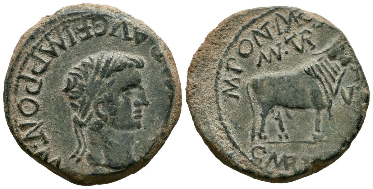 TURIASO (Tarazona, Zaragoza). As. (Ae. 12,51g/28mm). 14-36 d.C. (FAB-2450). Anv: Cabeza de Tiberio laureada a derecha, alrededor leyenda: TI CAESAR AVG F IMP PONT M. Rev: Toro sobre de línea, encima: MVN TVR, delante: II VIR, alrededor leyenda: M PONT MARSO C MARI VEGETO. MBC+.