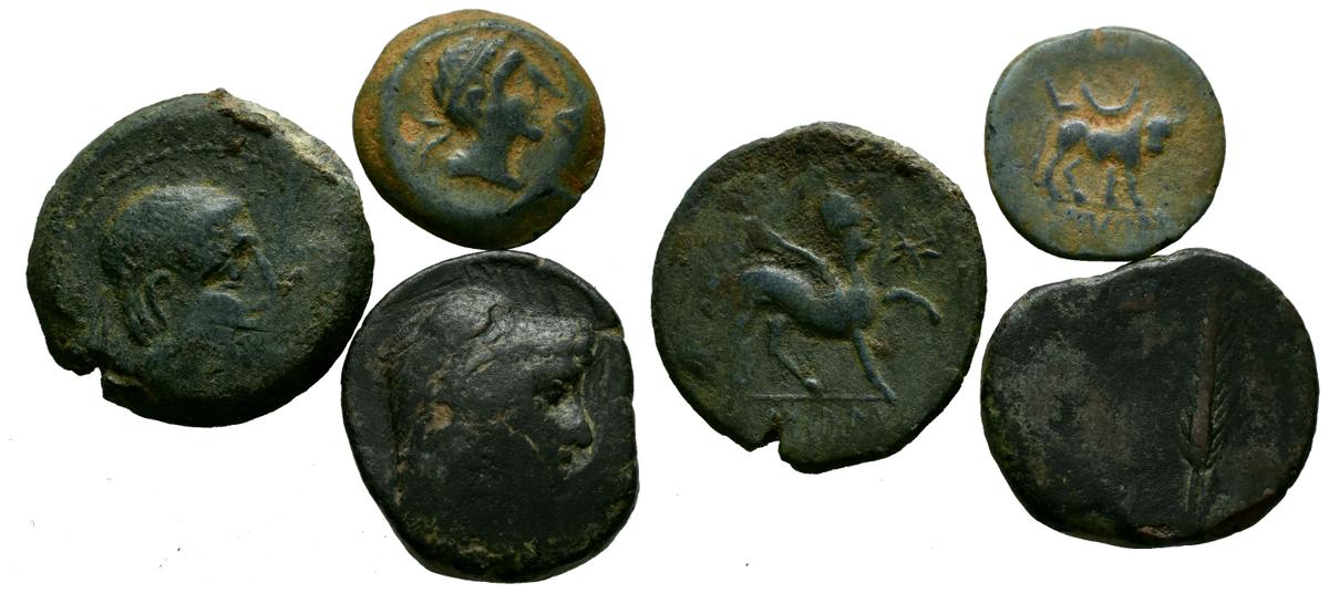 Conjunto de tres monedas de bronce de las cecas de Callet (1 As) y Castulo (1 As y 1 Semis). A EXAMINAR.