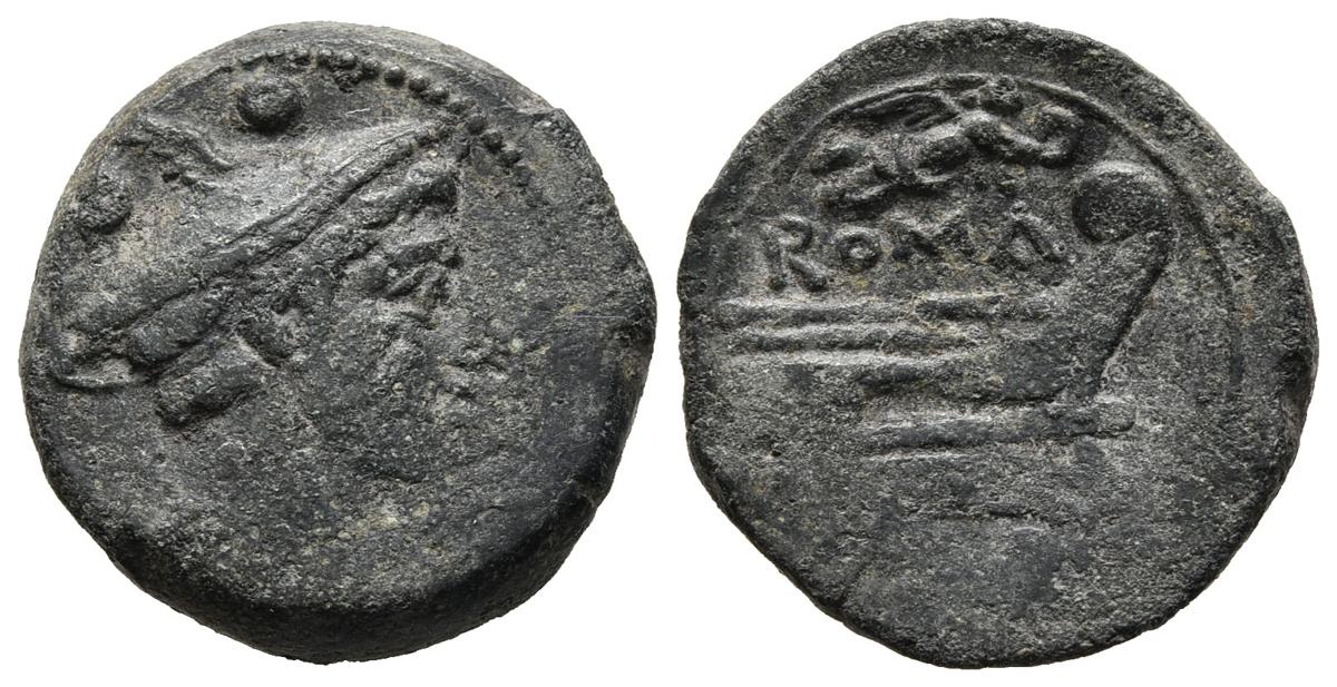 ACUÑACIONES ANONIMAS. Sextante. (Ae. 4,76g/19mm). 211-208 a.C. Roma. (Crawford 61/6). Anv: Busto drapeado con pétaso de Mercurio a derecha, encima dos puntos. Rev: Proa a derecha, encima Victoria volando a derecha con corona de laurel y leyenda: ROMA. MBC.