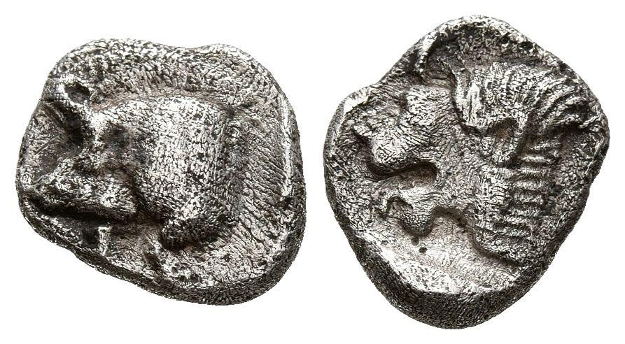 KYZIKOS, Misia. Hemióbolo. (Ae. 0,71g/10mm). 550-500 a.C. (SNG BN 385). Anv: Parte delantera de Jabalí a izquierda. Rev: Cabeza de león a izquierda. MBC.