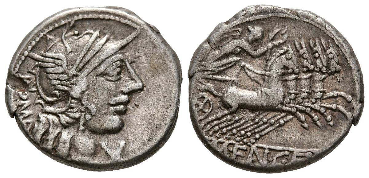 GENS FANNIA. Denario. (Ar. 3,88g/18mm). 123 a.C. Roma. (FFC 705; Crawford 275/1). Anv: Cabeza de Roma a derecha, delante X, detrás leyenda: ROMA. Rev: Victoria con corona en cuádriga a derecha, en exergo: M FAN CF. MBC.