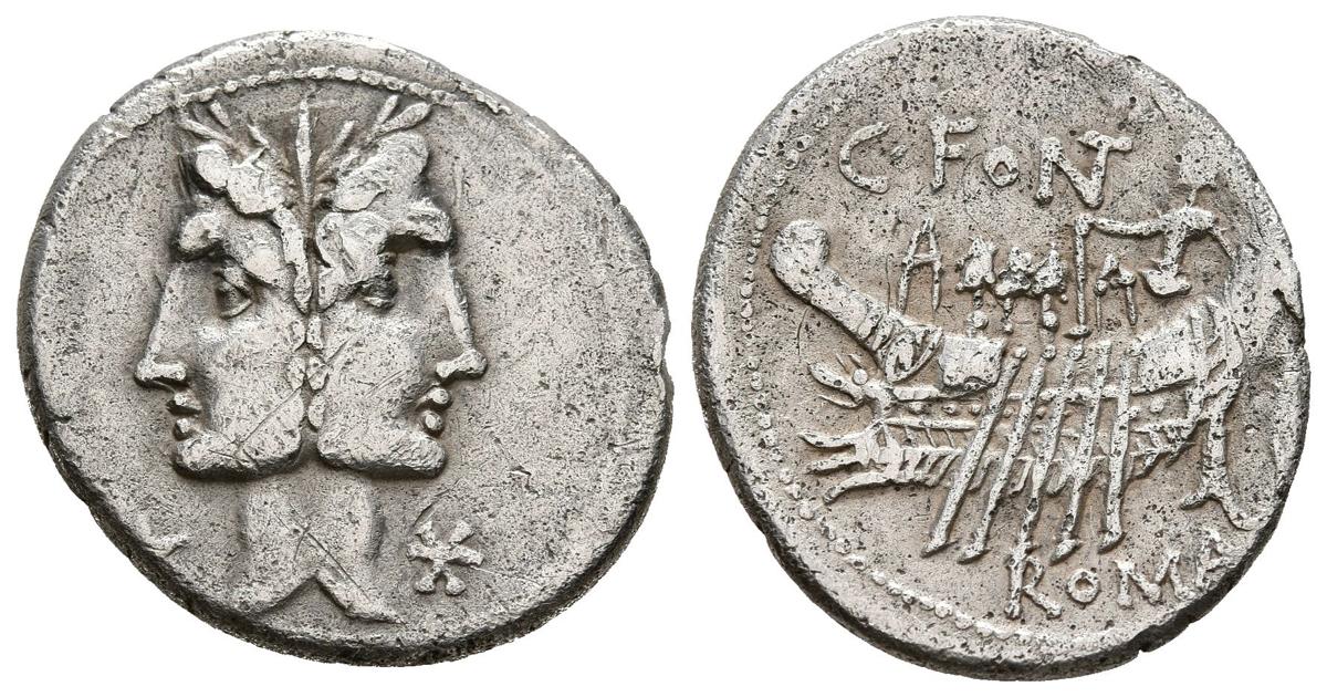 GENS FONTEIA. Denario. (Ar. 3,22g/20mm). 114-113 a.C. Sur de Italia. (FFC 713; Crawford 290/1). Anv: Cabeza bifronte de Fontus, hijo de Jano, debajo de la barbilla letra y estrella. Rev: Galera a izquierda con timonel y tres filas de remeros, encima leyenda: C FONT, debajo leyenda: ROMA. MBC-.