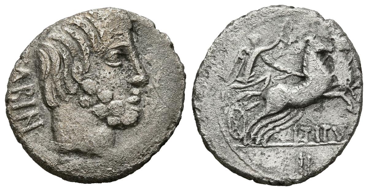 GENS TITURIA. Denario. (Ar. 3,41g/18mm). 89 a.C. Roma. (Crawford 344/3; FFC 1148). Anv: Cabeza de Tatius a derecha, detrás leyenda: SABIN. Rev: Victoria con corona en biga a derecha, debajo leyenda: L TITVRI, en exergo: II. MBC-.
