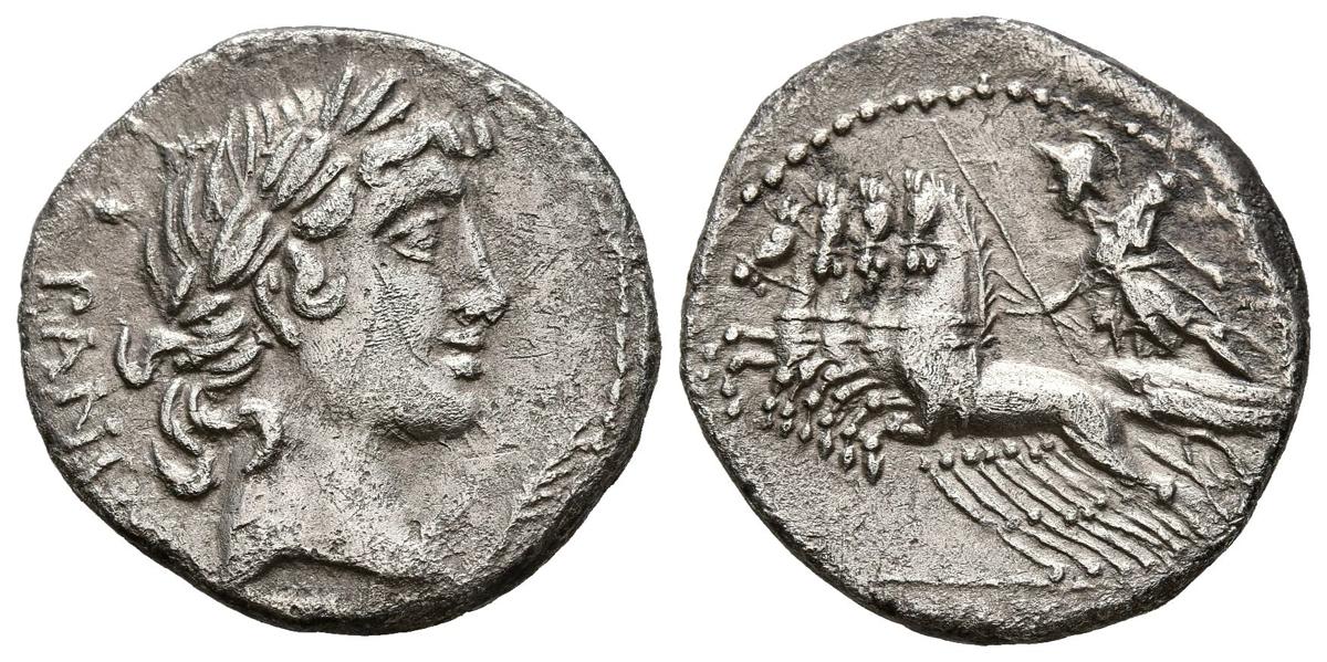 GENS VIBIA. Denario. (Ar. 3,19g/17mm). 90 a.C. Taller auxiliar de Roma. (FFC 1204; Crawford 342/4b). Anv: Cabeza laureada de Apolo a derecha debajo de la barbilla palma, detrás leyenda: PANSA. Rev: Minerva con trofeo y cetro conduciendo cuádriga a izquierda, en exergo: C VIBIVS CF. MBC.