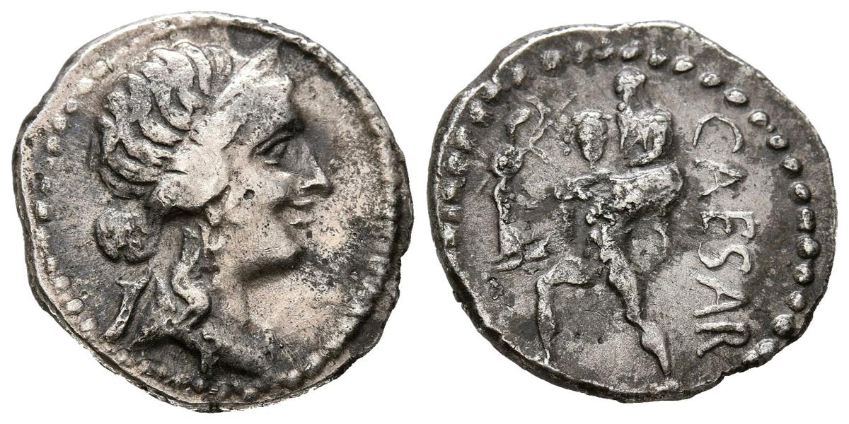 JULIO CESAR. Denario. (Ar. 3,55g/18mm). 47-46 a.C. Ceca militar móvil en el Norte de Africa. (Crawford 458/1; FFC 10). Anv: Cabeza diademada de Venus a derecha. Rev: Aenas avanzando a izquierda llevando en brazos a Anchises y palladium, detrás leyenda: CAESAR. MBC. Escaso ejemplar.