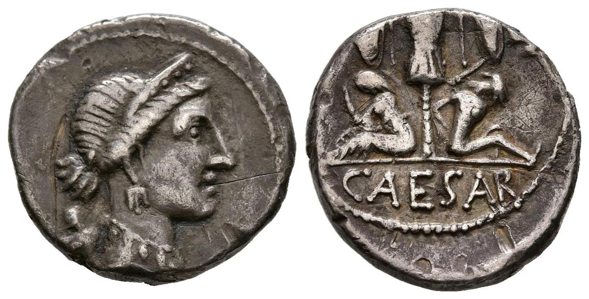 JULIO CESAR. Denario. (Ar. 3,77g/18mm). 46-45 a.C. Ceca militar móvil en la Península Ibérica. (Crawford 468/1; FFC 11). Anv: Cabeza diademada de Venus a derecha, detrás cupido. Rev: Trofeo de armas entre Galia sentada a izquierda y Vercingetorix sentado a derecha, en exergo: CAESAR. MBC. Escaso ejemplar.