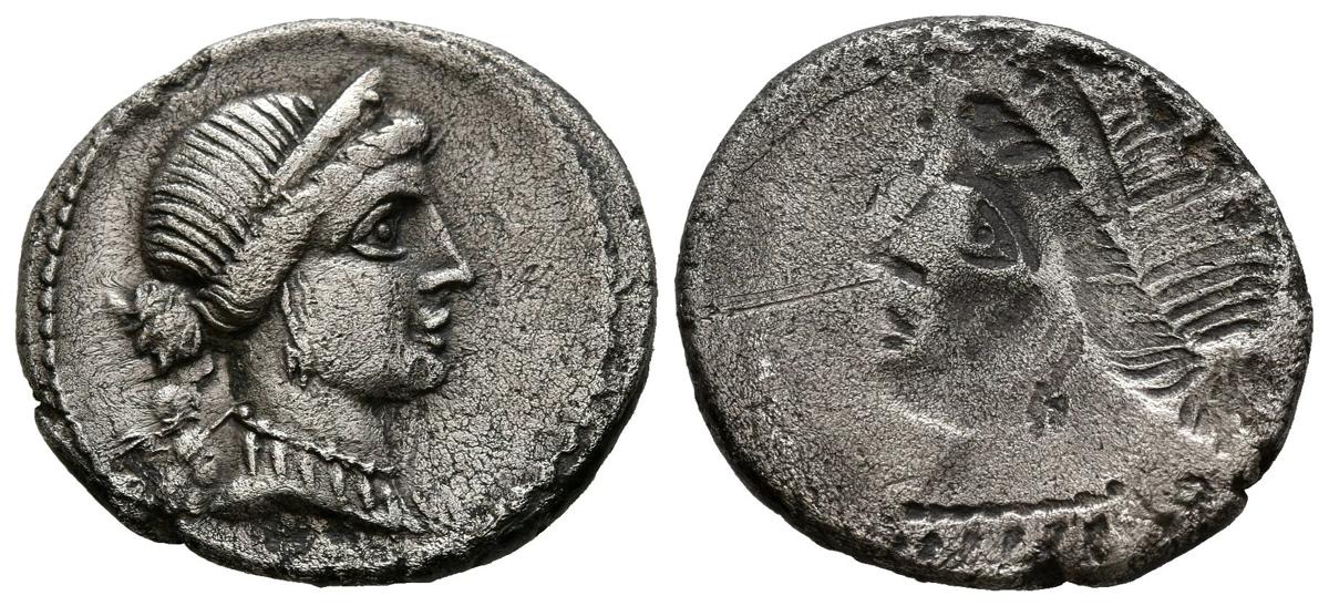 JULIO CESAR. Denario. (Ar. 3,62g/19mm). 48-47 d.C. Ceca militar móvil. (Crawford 468/1; FFC 11). Anv: Cabeza diademada de Venus a derecha, detrás cupido. Rev: Anverso incuso. MBC. Escaso ejemplar.