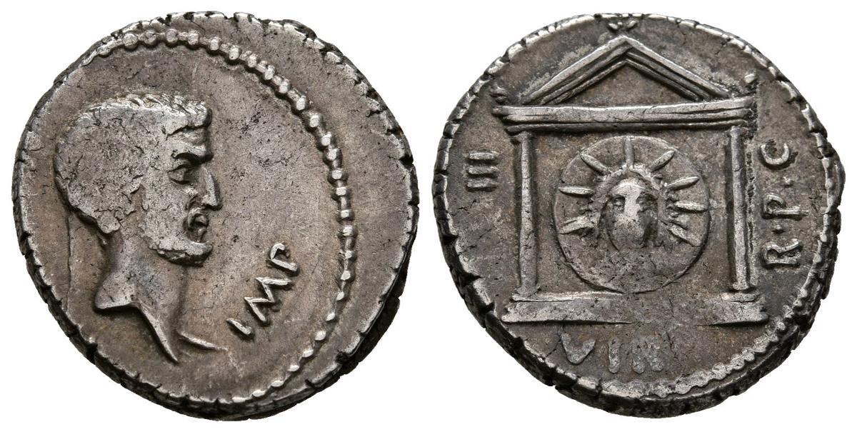 MARCO ANTONIO. Denario. (Ar. 3,75g/17mm). 42 a.C. Ceca volante. (FFC 17; Crawford 496-1). Anv: Cabeza descubierta y barbada a derecha de Marco Antonio, alrededor leyenda: IMP M ANTONI. Rev: Cabeza radiada de Sol de frente dentro de templo dístilo, alrededor leyenda: III VIR RPC. MBC/MBC+. Vanos de acuñación. Escaso y bonito ejemplar.