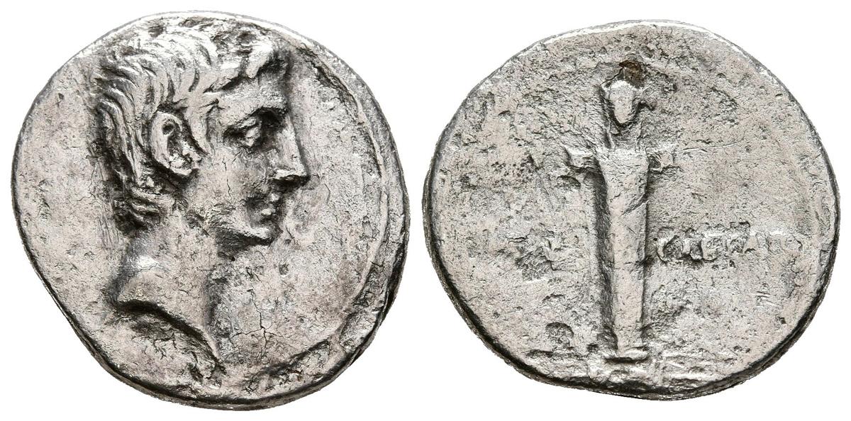 OCTAVIO. Denario. (Ar. 3,22g/19mm). 30-29 a.C. Roma. (RIC 271). Anv: Cabeza de Octavio a derecha. Rev: Estatua de Octavio de frente con lanza encima de columna decorada, entre: IMP-CAESAR. MBC-. Oxidaciones limpiadas.