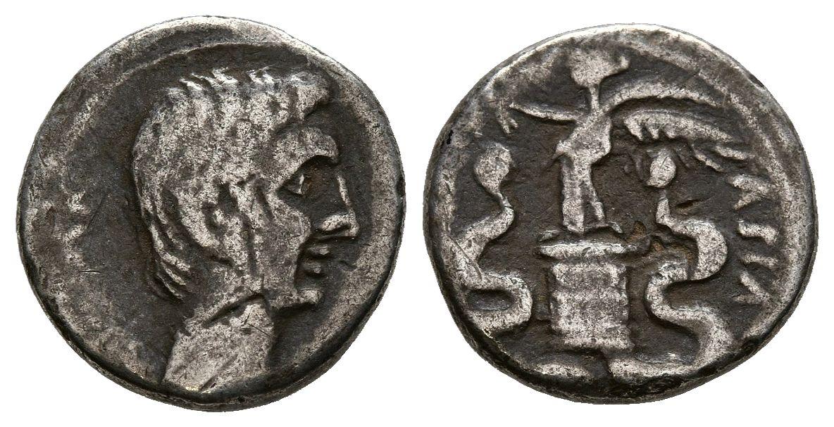 AUGUSTO. Quinario. (Ar. 1,48g/12mm). 29-28 a.C. Ceca italiana incierta. (RIC 276). Anv: Cabeza de Augusto a derecha, alrededor leyenda: CAESAR IMP VII. Rev: Victoria drapeada con corona y palma estante a izquierda sobre cista mística entre dos serpientes, alrededor leyenda: RECEPTA ASIA. MBC.