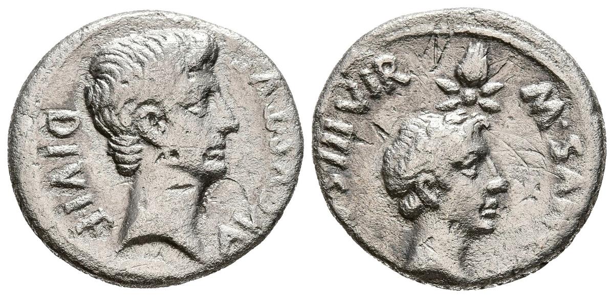 AUGUSTO y JULIO CESAR. Denario. (Ar. 3,60g/19mm). 17 a.C. Roma. (RIC 338). Anv: Cabeza de Augusto a derecha, alrededor leyenda: DIVI F AVGVSTVS. Rev: Cabeza jóven de Julio César a derecha, encima cometa con rayos, alrededor leyenda: M SANQVI NIVS III VIR. MBC. Limpiado. Escaso ejemplar.