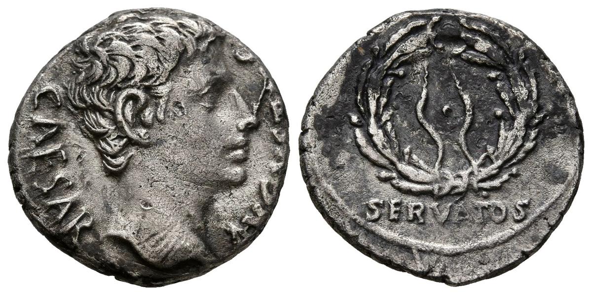 AUGUSTO. Denario. (Ar. 3,65g/17mm). 19 a.C. Colonia Patricia. (RIC 75a). Anv: Cabeza de Augusto a derecha, alrededor leyenda: AVGVSTVS CAESAR. Rev: Corona de laurel, alrededor leyenda: OB CIVIS SERVATOR. MBC.