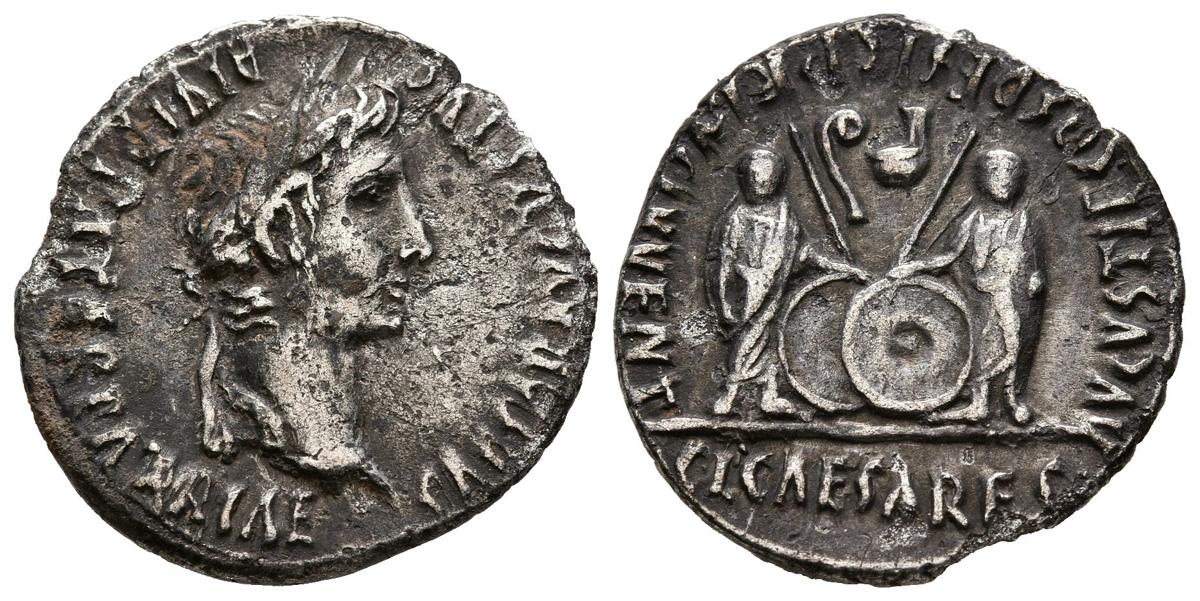 AUGUSTO. Denario. (Ar. 3,47g/20mm). 7-6 a.C. (RIC 207). Anv: Cabeza laureada de Augusto a derecha, alrededor leyenda: CAESAR AVGVSTVS DIVI F PATER PATRIAE. Rev: Cayo y Lucio estantes de frente, entre ellos escudo y lanzas, en campo símpulo y lítuo, en exergo: CL CAESARES, alrededor leyenda: AVGVSTI F COS DESIG PRINC IVVENT. MBC.
