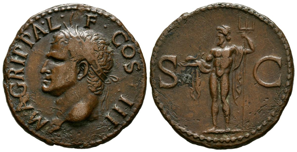 AGRIPA I. As. (Ae. 10,16g/28mm). 37-41 d.C. Roma. (RIC 58). Anv. Cabeza laureada de Agripa a izquierda, alrededor leyenda: AGRIPPA L F COS III. Rev: Neptuno estante a izquierda portando delfín y tridente, entre S-C. MBC+.