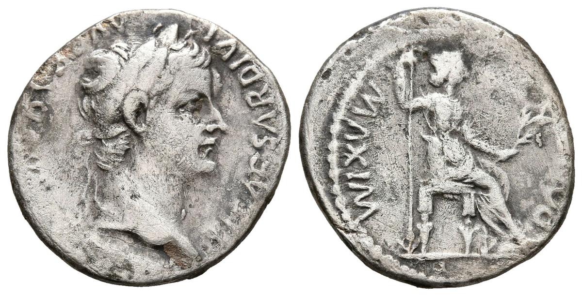 TIBERIO. Denario. (Ar. 3,38g/19mm). 36-37 d.C. Lugdunum. (RIC 30). Anv: Cabeza de Tiberio a derecha, alrededor leyenda: TI CAESAR DIVI AVG AVGVSTVS. Rev: Livia sentada a derecha con rama y cetro, alrededor leyenda: MAXIM PONTIF. MBC-.