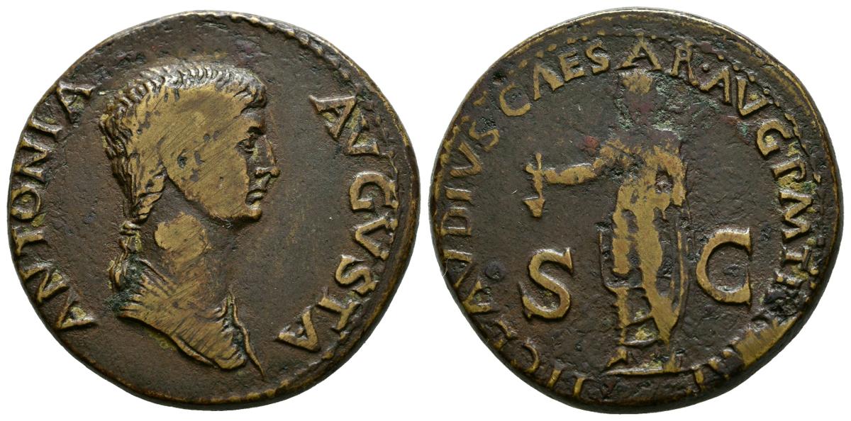 ANTONIA. Dupondio. (Ae. 12,99g/28mm). 41-42 d.C. Roma. (RIC 92). Anv: ANTONIA AVGVSTA. Busto drapeado a derecha con el pelo recogido a derecha de Antonia. Rev: TI CLAVDIVS CAESAR AVG P M TR P IMP P P. Claudio estante velado a izquierda portando símpulo. MBC. Escaso ejemplar.