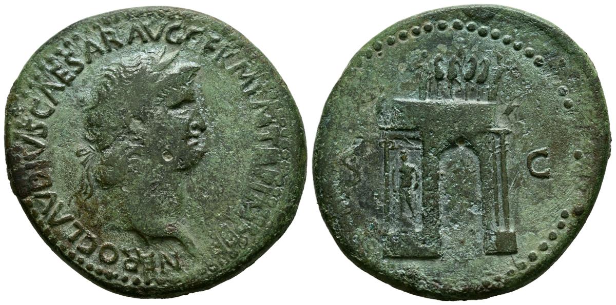 NERON. Sestercio. (Ae. 22,34g/37mm). 64 d.C. Roma. (RIC 149). Anv: Cabeza laureada de Nerón a derecha, alrededor leyenda: NERO CLAVDIVS CAESAR AVG GERM P M TR P IMP PP. Rev: Arco Triunfal, dentro de él figura humana, encima Nerón conduciendo cuádriga de frente flanqueada por Pax Y Victoria, entre S-C. MBC. Pátina verde. Escaso.