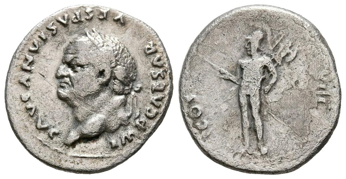 VESPASIANO. Denario. (Ar. 3,20g/18mm). 77-78 d.C. Roma. (RIC 938). Anv: Cabeza laureada de Vespasiano a derecha, alrededor leyenda: IMP CAESAR VESPASIANVS AVG. Rev: Marte estante a izquierda portando trofeo y vara, alrededor leyenda: COS VIII. MBC/MBC-.