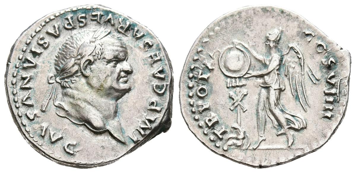 VESPASIANO. Denario. (Ar. 3,53g/19mm). 79 d.C. Roma. (RIC 1068). Anv: Cabeza laureada de Vespasiano a derecha, alrededor leyenda: IMP CAESAR VESPASIANVS AVG. Rev: Victoria avanzando a izquierda colgando escudo sobre trofeo, alrededor leyenda: TR POT X COS VIIII. EBC-. Bonito ejemplar, escaso así.