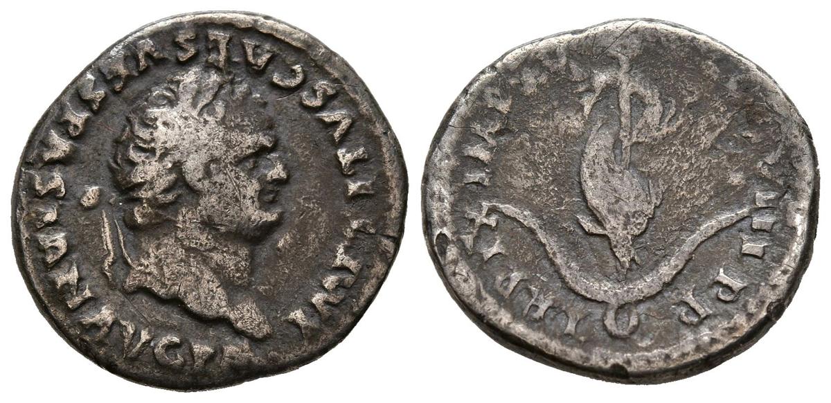 TITO. Denario. (Ar. 3,04g/17mm). 80 d.C. Roma. (RIC 112). Anv: Cabeza laureada de Tito a derecha, alrededor leyenda: IMP TITVS CAES VESPASIAN AVG P M. Rev: Delfín alrededor de ancla, alrededor leyenda: TR P IX IMP XV COS VIII P P. MBC/MBC-.