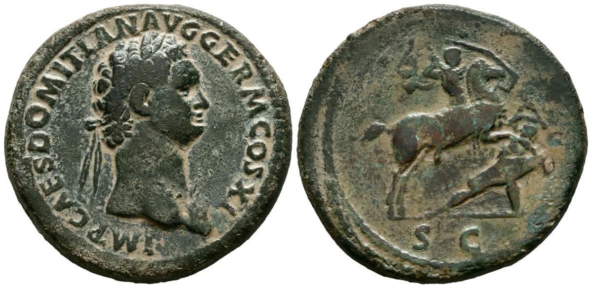 DOMICIANO. Sestercio. (Ae. 24,36g/35mm). 85 d.C. Roma. (RIC 280). Anv: Cabeza laureada de Domiciano a derecha, alrededor leyenda: IMP CAES DOMITIAN AVG GERM COS XI. Rev: Domiciano sobre caballo con escudo y lanza atacando a cautivo, en exergo SC. MBC. Pátina verde. Escaso ejemplar.