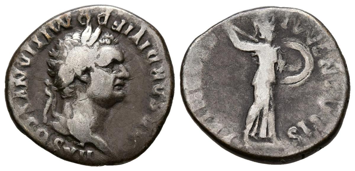 DOMICIANO. Denario. (Ar. 3,00g/17mm). 80-81 d.C. Roma. (RIC 268). Anv: Cabeza laureada de Domiciano a derecha, alrededor leyenda: CAESAR DIVI F DOMITIANVS COS VII. Rev: Minerva estante a derecha portando lanza y escudo, alrededor leyenda: PRINCEPS IVVENTVTIS. MBC-.