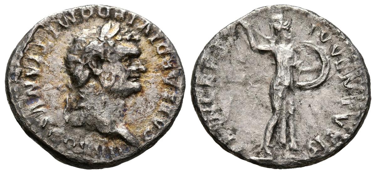 DOMICIANO. Denario. (Ar. 2,85g/18mm). 80 d.C. Roma. (RIC 268). Anv: Cabeza laureada de Domiciano a derecha, alrededor leyenda: CAESAR DIVI F DOMITIANVS ACOS VII. Rev: Minerva avanzando a derecha portando lanza y escudo, alrededor leyenda: PRINCEPS IVVENTVTIS. MBC-.
