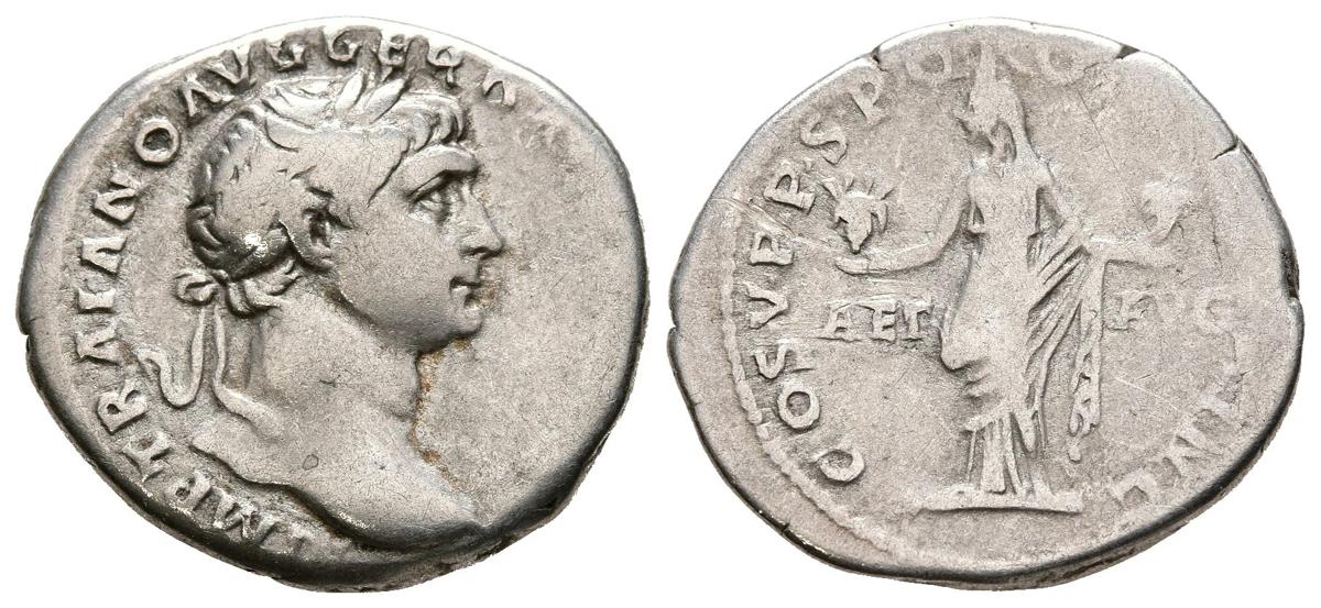 TRAJANO. Denario. (Ar. 3,10g/19mm). 103-111 d.C. Roma. (RIC 91). Anv: Cabeza laureada de Trajano a derecha, alrededor leyenda: IMP TRAIANO AVG GER DAC P M TR P P. Rev: Aeternitas estante a izquierda portando en ambas manos las cabezas de Luna y Sol, entre: AET-AVG, alrededor leyenda: COS V P P SPQR OPTIMO PRINC. MBC-.