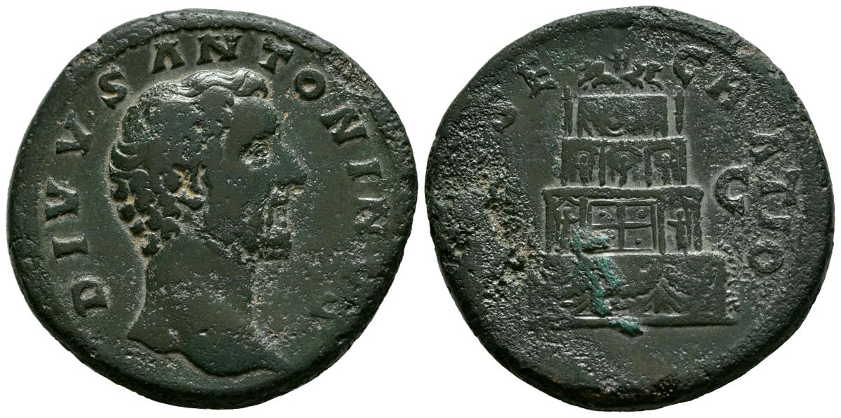 DIVO ANTONINO PIO. Sestercio. (Ae. 29,46g/33mm). 161 d.C. Roma. (RIC 1266 var). Anv: Busto de Antonino Pío a derecha con drapeado sobre hombro izquierdo, alrededor leyenda: DIVVS ANTONINVS. Rev: Pira funeraria de cuatro pisos decorada, entre: S-C, alrededor leyenda: CONSECRATIO. MBC. Pátina verde. Escaso ejemplar. Oxidaciones.