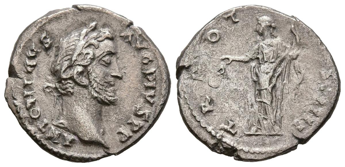 ANTONINO PIO. Denario. (Ar. 2,45g/18mm). 145-161 d.C. Roma. (RIC 153). Anv: Cabeza laureada de Antonino Pío a derecha, alrededor leyenda: ANTONINVS AVG PIVS P P. Rev: Pax estante a izquierda portando rama y cornucopia, alrededor leyenda: TR POT COS IIII. MBC.