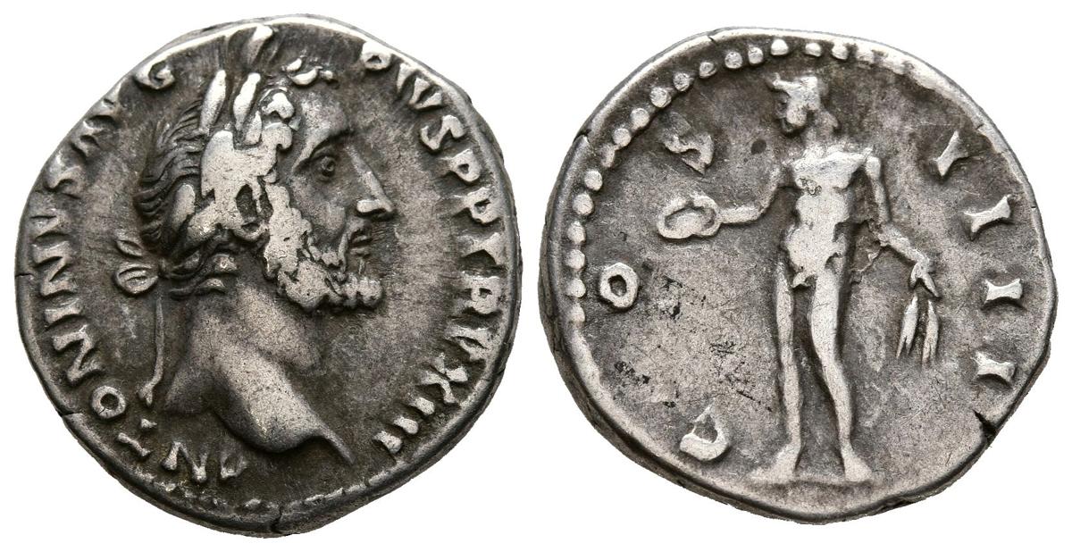 ANTONINO PIO. Denario. (Ar. 3,67g/17mm). 149-150 d.C. Roma. (RIC 189). Anv: Cabeza laureada de Antonino Pío a derecha, alrededor leyenda: ANTONINVS AVG PIVS P P TR P XIII. Rev: Genio estante a izquierda portando patera y granos de trigo, alrededor leyenda: COS IIII. MBC-.