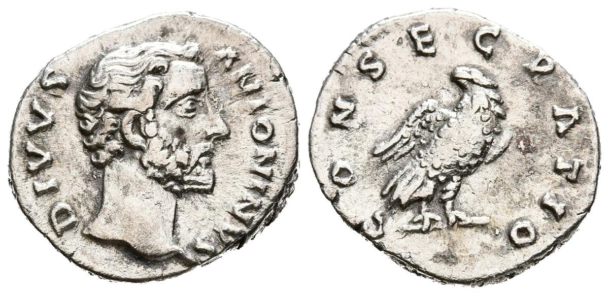 DIVO ANTONINO PIO. Denario. (Ar. 3,27g/18mm). 161 d.C. Roma. (RIC 429). Anv: Cabeza de Antonino Pío a derecha, alrededor leyenda: DIVVS ANTONINVS. Rev: Aguila estante mirando a izquierda, alrededor leyenda: CONSECRATIO. MBC. Limpiado.