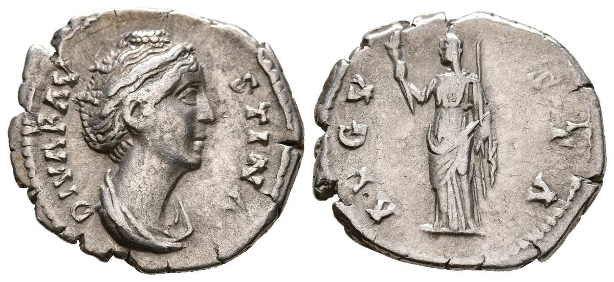 FAUSTINA I. Denario. (Ar. 3,15g/19mm). 141 d.C. Roma. (RIC 356). Anv: Busti diademado y drapeado de Faustina I a derecha, alrededor leyenda: DIVA FAVSTINA. Rev: Ceres estante a izquierda portando antorcha y cetro, alrededor leyenda: AVGVSTA. MBC+/MBC.