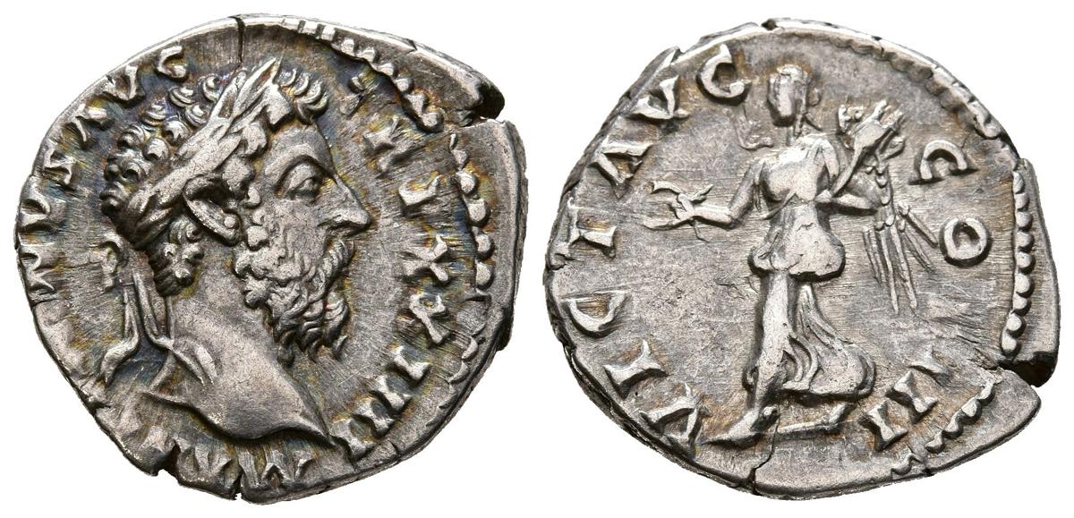 MARCO AURELIO. Denario (Ar. 3,32g/19mm). 169-170 d.C. Roma. (RIC 225). Anv: cabeza laureada del emperador a derecha alrededor leyenda: M ANTONINVS AVG TR P XXIIII. Rev: Victoria en marcha a izquierda con guirnalda y trofeo, alrededor leyenda: VICT AVG COS III. MBC.