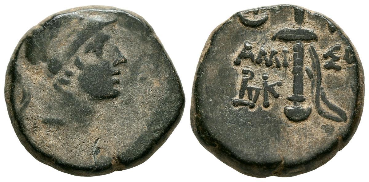 PONTOS, Amisos. Ae21. (Ae. 8,52g/21mm). 111-105 a.C. (HGC 7,241). Anv: Cabeza con casco de Ares. Rev: Espada en vaina, entre leyenda griega. MBC.