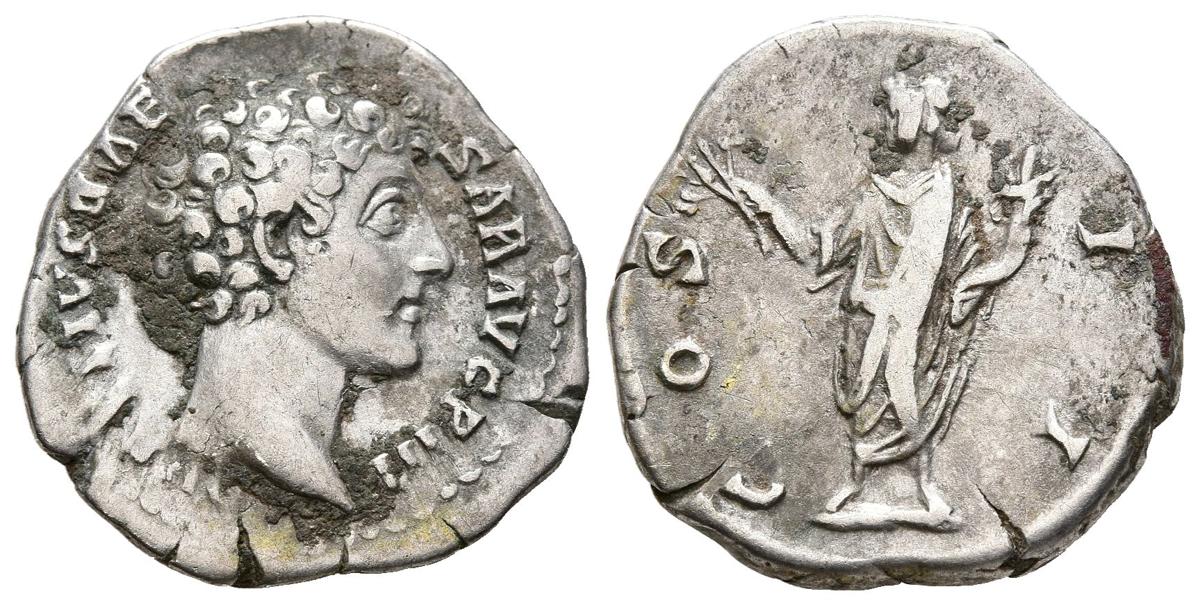 MARCO AURELIO. Denario. (Ar. 3,45g/18mm). 145-147 d.C. Roma. (RIC 429a). Anv: Cabeza de Marco Aurelio a derecha, alrededor leyenda: AVRELIVS CAESAR AVG PII F. Rev: Honos estante a izquierda portando rama y cornucopia, alrededor leyenda: COS II. MBC.