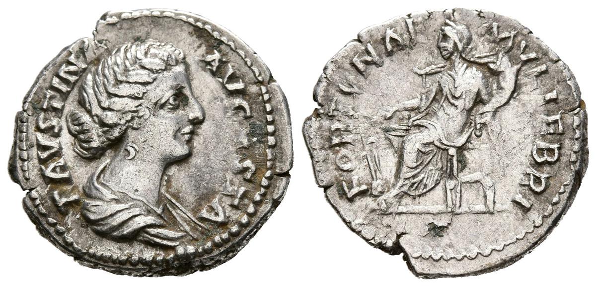 FAUSTINA II. Denario. (Ar. 3,41g/19mm). 170-176 d.C. Roma. (RIC 683). Anv: Busto drapeado de Faustina II a derecha, alrededor leyenda: FAVSTINA AVGVSTA. Rev: Fortuna sentada a izquierda portando timón y cornucopia, alrededor leyenda: FORTVNA MVLIEBRI. MBC+.