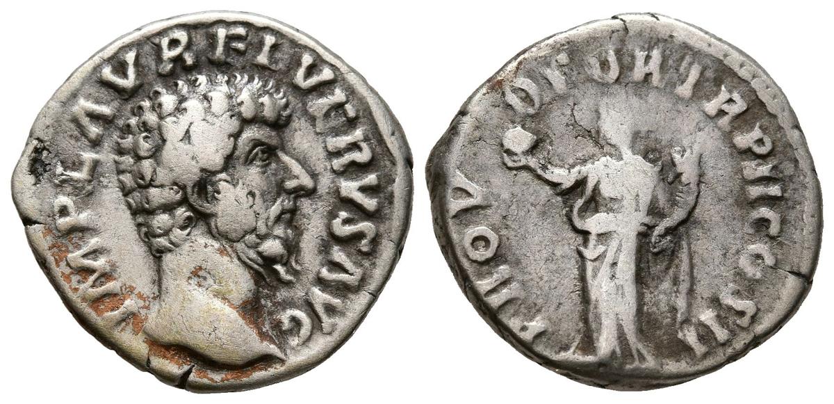 LUCIO VERO. Denario. (Ar. 3,36g/17mm). 161-162 d.C. Roma. (RIC 482). Anv: Cabeza de Lucio Vero a derecha, alrededor leyenda: IMP L AVREL VERVS AVG. Rev: Providentia estante a izquierda portando globo y cornucopia, alrededor leyenda: PROV DEOR TR P II COS II. MBC.