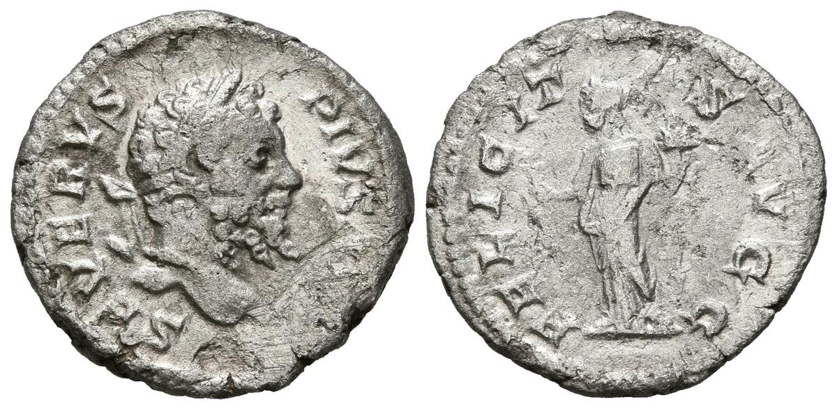 SEPTIMIO SEVERO. Denario. (Ar. 2,46g/19mm). 200-210 d.C. Roma. (RIC 261). Anv: Cabeza laureada de Septimio Severo a derecha, alrededor leyenda: SEVERVS PIVS. Rev: Felicitas estante a izquierda portando caduceo y cornucopia, alrededor leyenda: FELICITAS AVGG. MBC.