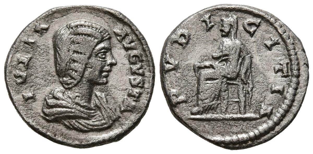 JULIA DOMNA. Denario. (Ar. 3,16g/18mm). 198-202 d.C. Roma. (RIC 576). Anv: Busto drapeado de Julia Domna a derecha, alrededor leyenda: IVLIA AVGVSTA. Rev: Pudicita sentada a izquierda, alrededor leyenda: PVDICITIA. MBC. Oxidaciones limpiadas.