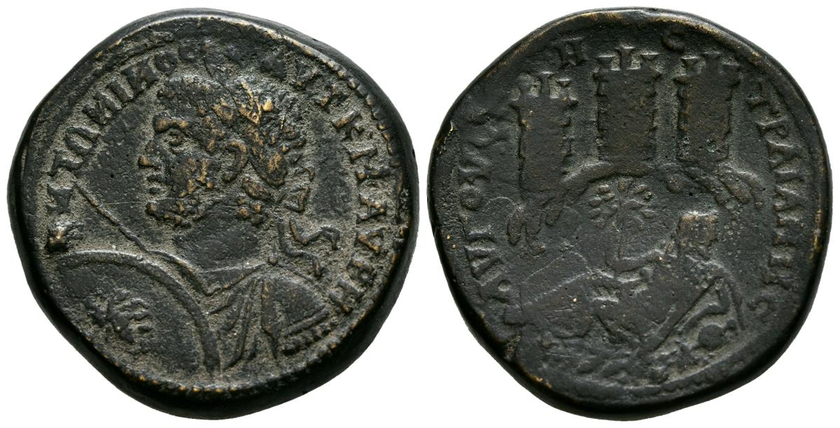 CARACALLA. Ae29. (Ae. 14,70g/29mm). 198-211 d.C. Augusta Traiana, Tracia. (Varbanov 1188 var). Anv: Busto laureado con coraza de Caracalla a izquierda portando escudo y lanza, alrededor leyenda griega. Rev: Muralla de tres torres, delante el dios Saurus acostado a izquierda, alrededor leyenda griega. MBC-. Raro ejemplar.