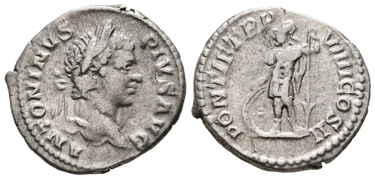 CARACALLA. Denario. (Ar. 3,30g/19mm). 206 d.C. Roma. (RIC 83). Anv: Cabeza laureada de Caracalla a derecha, alrededor leyenda: ANTONINVS PIVS AVG. Rev: Marte estante a izquierda portando lanza y escudo, alrededor leyenda: PONTIF TR P VIIII COS II. MBC.