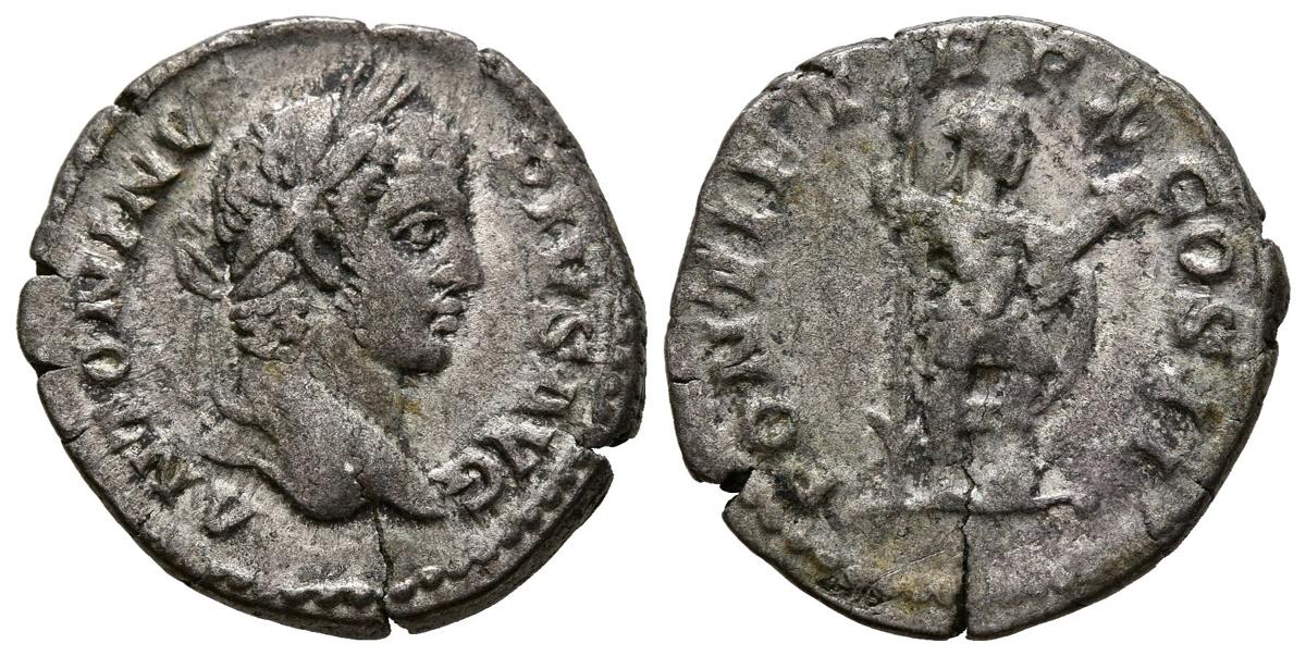 CARACALLA. Denario. (Ar. 3,31g/19mm). 207 d.C. Roma. (RIC 95). Anv: Cabeza laureada de Caracalla a derecha, alrededor leyenda: ANTONINVS PIVS AVG. Rev: Caracalla estante a derecha portando lanza y escudo, alrededor leyenda: PONTIF TR P X COS II. MBC-.